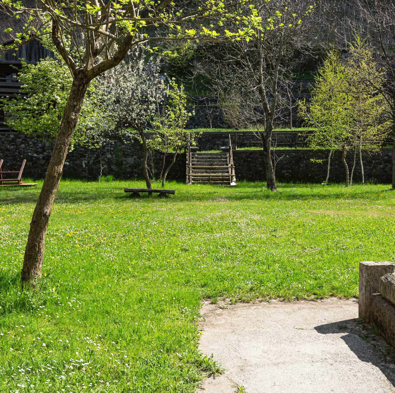 Il cortile, definito su tre lati dalle mura dell’edificio, è chiuso sul quarto da una loggetta dove sono esposti recipienti in pietra per grassi di grandi dimensioni, alcuni begli esemplari di secchiai in pietra, attrezzi agricoli. Dalla loggetta si accede al giardino. Era il broili di Casa Campeis che, con i suoi terrazzamenti ricavati dalle pendici dello Strabut, permetteva la coltivazione di alberi da frutta. Sulla parte pianeggiante le logge espongono attrezzi agricoli di grandi dimensioni, qualche esemplare di carro e della tipica slitta (la louge).